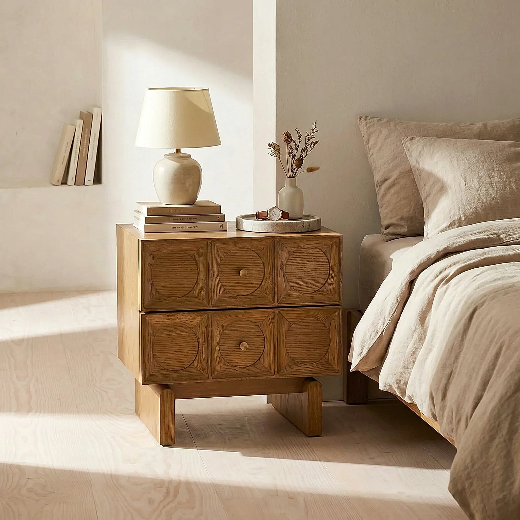 Elliot Ahşap Komodin, doğal malzeme estetiğini zarif ve zamansız tasarım çizgileriyle bir araya getiren özel bir yatak odası parçasıdır. Dengeli formu sayesinde bulunduğu alana sıcak, şık ve karakterli bir hava kazandırırken, işlevsel yapısıyla günlük kullanımda konfor sağlar.