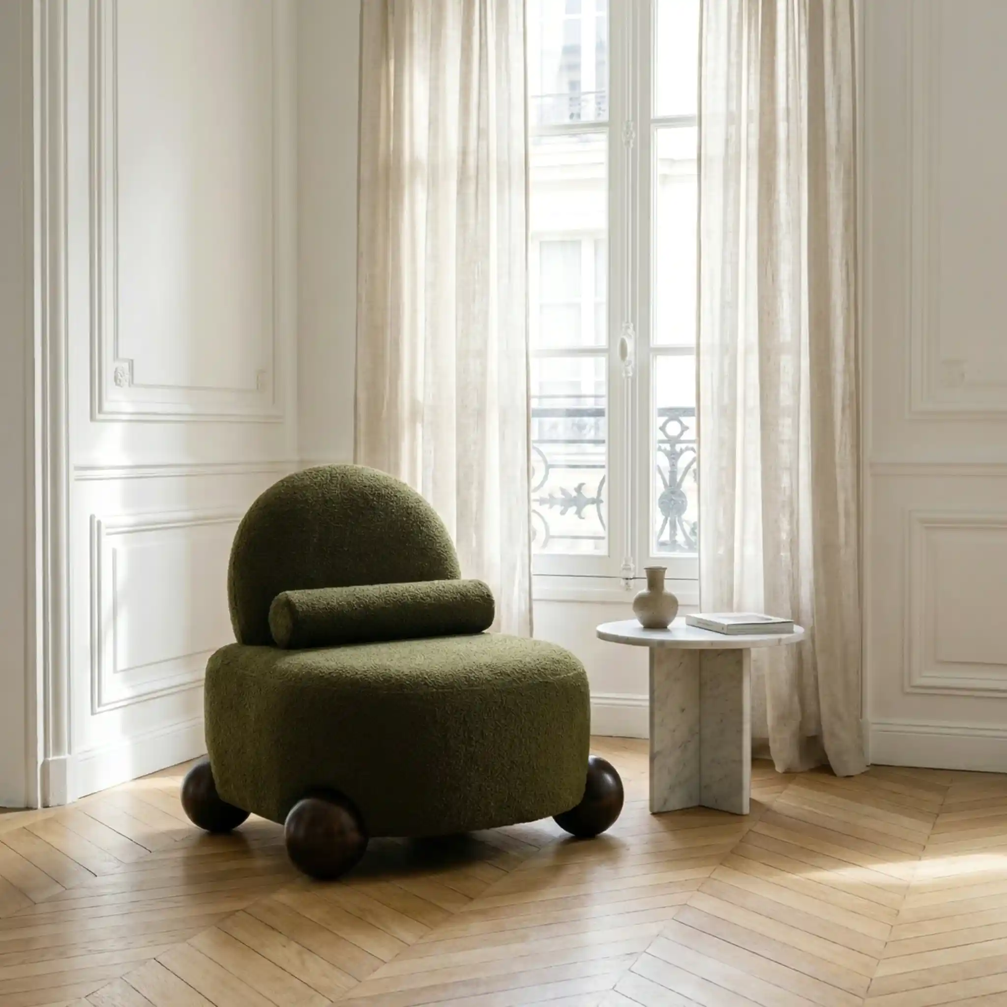 Bouclé kumaşın dokulu yapısı ve masif ahşap gövde, tasarıma hem sıcaklık hem de doğal bir estetik katar. Dayanıklı yapısı sayesinde uzun yıllar formunu korur.