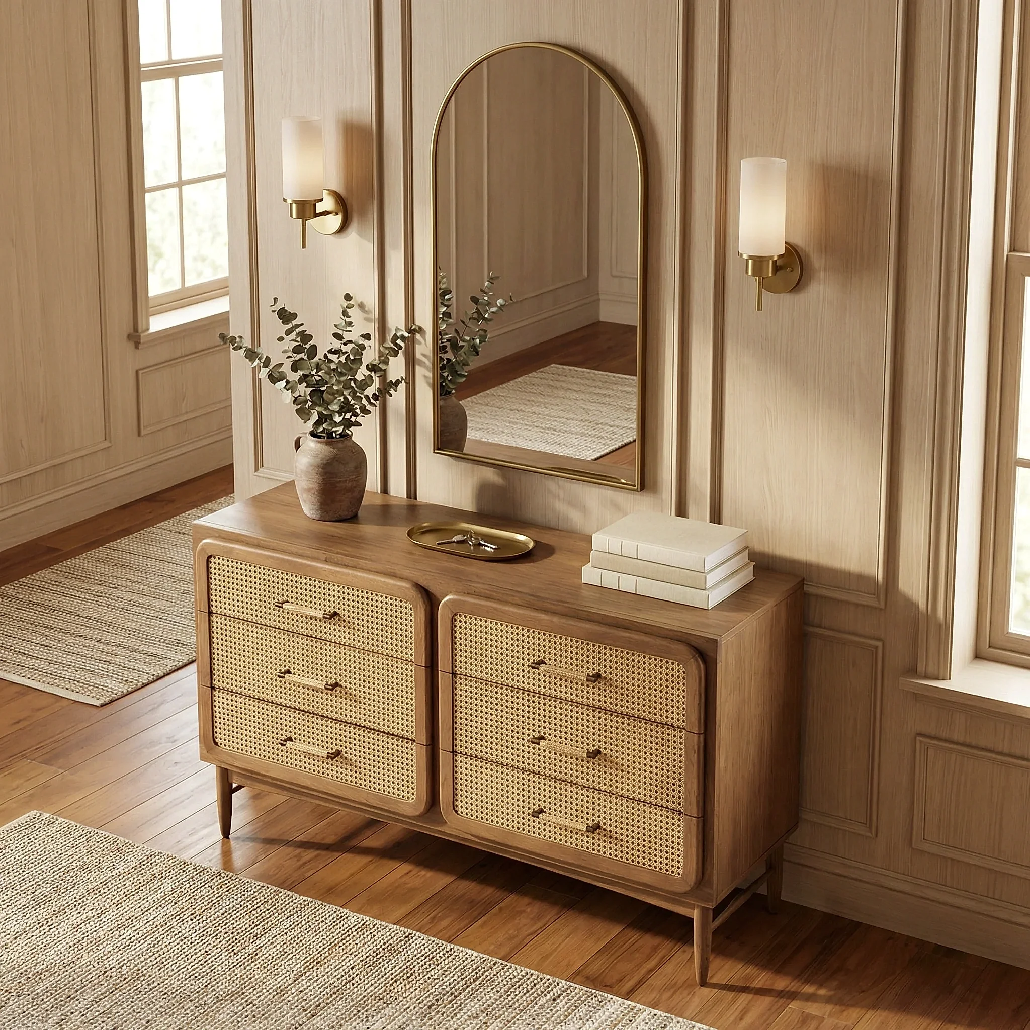 Rosaline Hazeranlı Ahşap Şifonyer, doğal malzeme estetiğini zamansız ve dengeli tasarım çizgileriyle bir araya getiren özel bir mobilya parçasıdır. Doğal ahşap görünümü ve güçlü formu sayesinde bulunduğu alana sıcak, şık ve karakterli bir hava kazandırırken, işlevsel yapısıyla günlük kullanımda konfor sağlar.