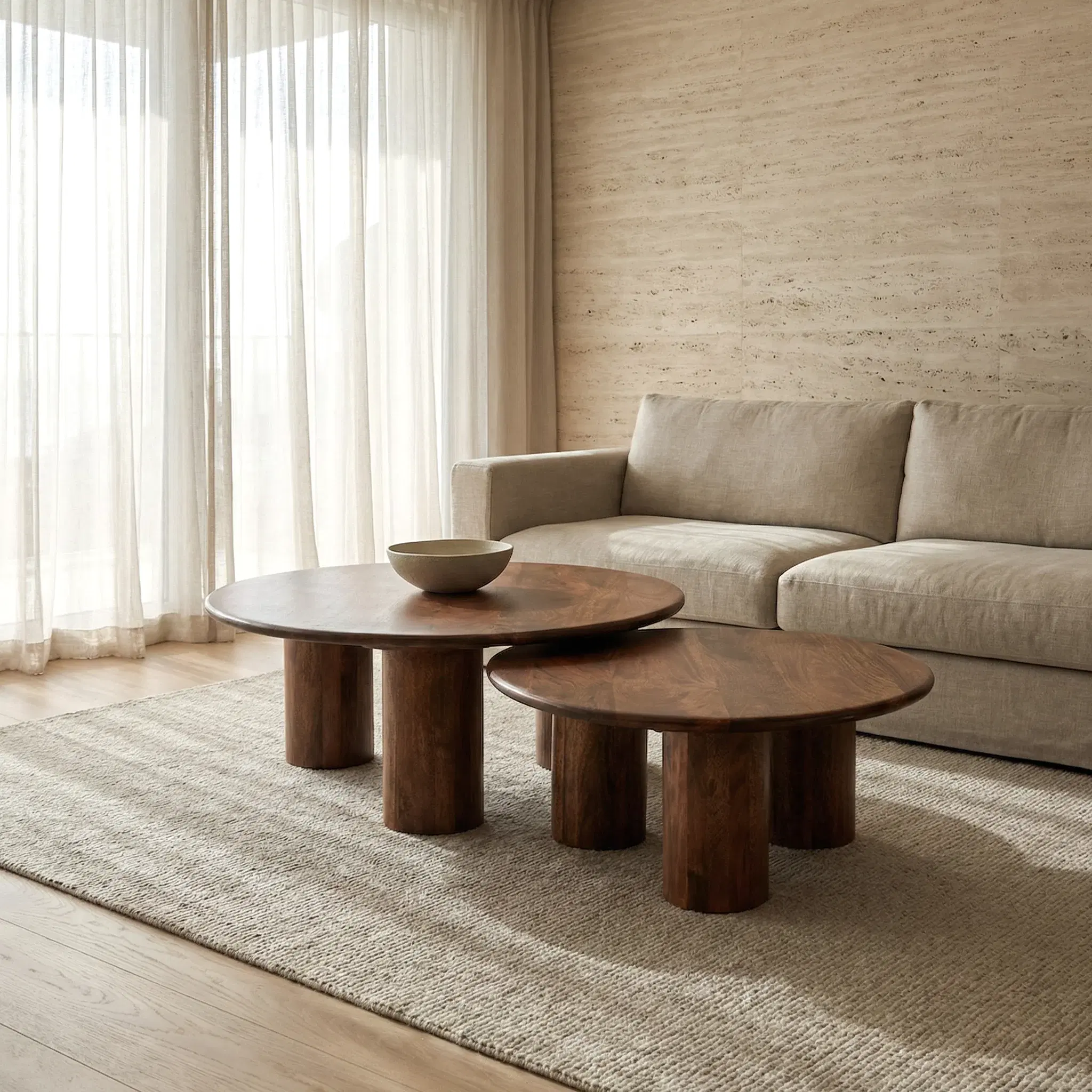 Vera Ceviz Ağacı İkili Orta Sehpa, yuvarlak formu ve üç büyük yuvarlak ayağıyla hem estetik hem de fonksiyonel bir set sunar. Tamamen el yapımı olarak üretilen bu sehpa setinde kullanılan masif ceviz ağacı, zengin damar dokusu ve sıcak kahverengi tonlarıyla öne çıkar. Her ağaç doğal yapısı gereği farklı desen ve renklere sahip olduğundan, her Vera sehpa tamamen benzersizdir.
